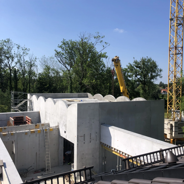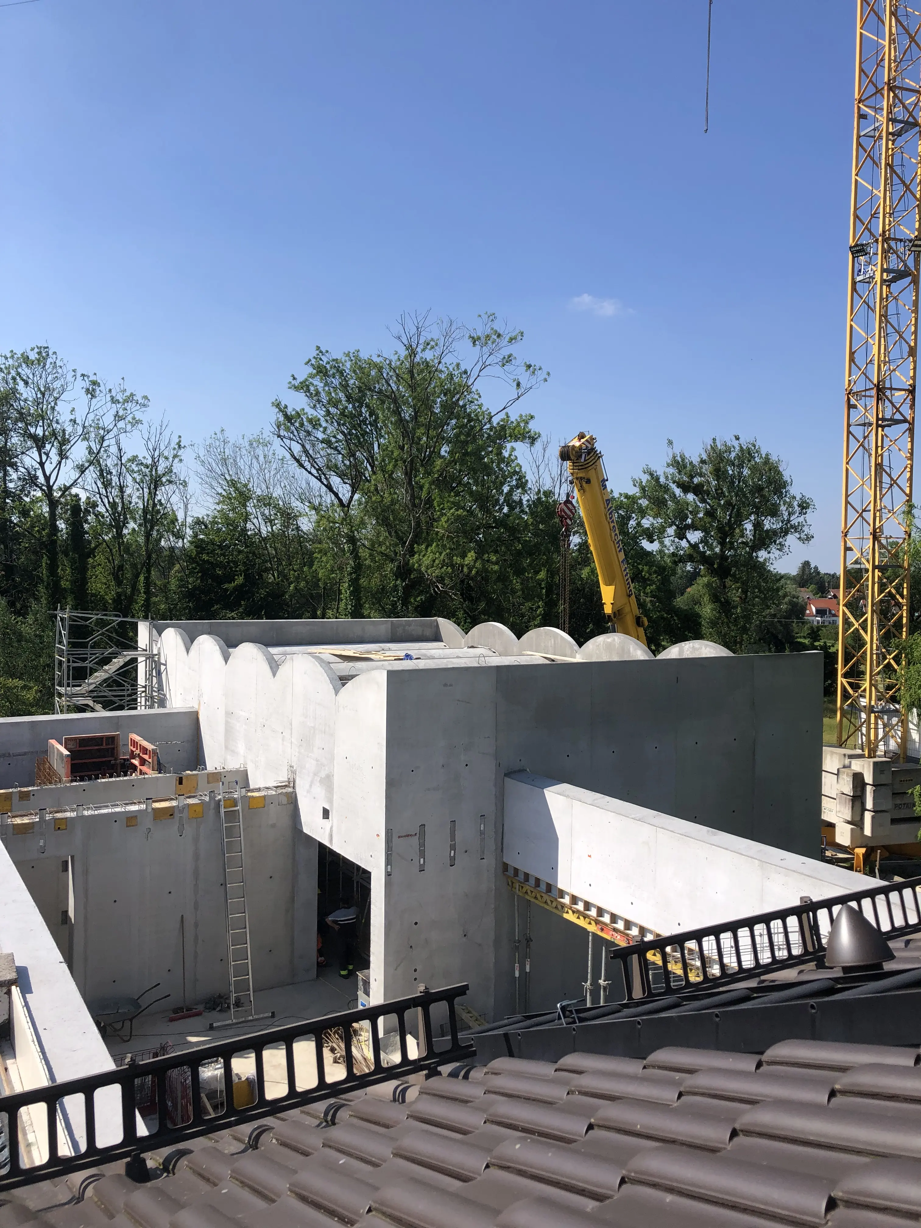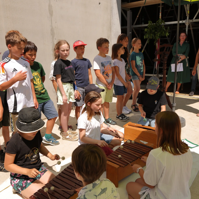 A roof for its birthday. The Carl Orff Foundation celebrates 10 July 2024 with a topping-out ceremony. In June, the time had finally come: the new building of the COMU Carl Orff Museum at Ziegelstadel 1 in Dießen got a new roof. Construction workers used two cranes to lift 11 tonnes of vaulted ceiling onto the large exhibition hall. Almost 70 years after Carl Orff himself celebrated the extension of his house at Ziegelstadel 1, another topping-out ceremony took place. Pupils from the Carl Orff School in Dießen opened the celebration with songs. Secretary General Judith Janowski then welcomed those present and expressed her particular thanks to all the sponsors who have generously supported the museum. Last but not least, site manager Torsten Huhle from the contractor Lutzenberger, foreman Christoph Meyer and concrete expert Lukas Schröther gave the topping-out speech and emptied their glasses three times to the applause of the guests: ‘May the museum be a place of knowledge, wonder and inspiration, where history comes alive and knowledge flourishes.’ Following the ceremony, celebrations took place in the courtyard of the Orff estate. Guests were able to enjoy food and drink. At an improvised table with instruments and playing cards, they had the opportunity to test a hands-on station of the future museum for the first time and sing a birthday song to Carl Orff. Fotos: Michael Tschuschner und COMU | COS Richtfest 1955 Bauarbeiter stehen auf dem Dachstuhl, am Giebel ist ein geschmücktes Bäumchen © COS Carl Orff auf dem Dachstuhl Carl Orff steht im Anzug auf dem Dachstuhl seines Hauses. © COS Das Museum bekommt ein Tonnendach Mit dem Kran wird ein Tonnenteil in ein modernes Gebäude eingesetzt. © COS Der erste Schritt fürs Dach ist gemacht! Alle Betonteile sind verbaut Ein modernes Betongebäude mit mehreren halbmondförmigen Kuppeln am Giebel. © COS Die Richtkrone An einem Baukran hängt eine große grünumwundene Krone. © COS Kinder singen ein Ständchen zum Richtfest Kinder singen und spielen auf Xylosphonen. © Foto: Michael Tschuschner Die Bauleute sprechen den Richtspruch Über den Rand eines Betongebäudes im Rohbau ragen drei Köpfe mit Helmen. © Foto: Michael Tschuschner Buffet fürs Richtfest Auf einem Buffet stehen Platten mit Essen und Blumendeko und Tellerstapel. © COS Ein Geburtstagsständchen für Carl Orff Frauen stehen an einem Tisch mit vielen Instrumenten und machen Musik. © COS Artikel in News • 19. Jul 2024 Teilen Twitter Facebook LinkedIn